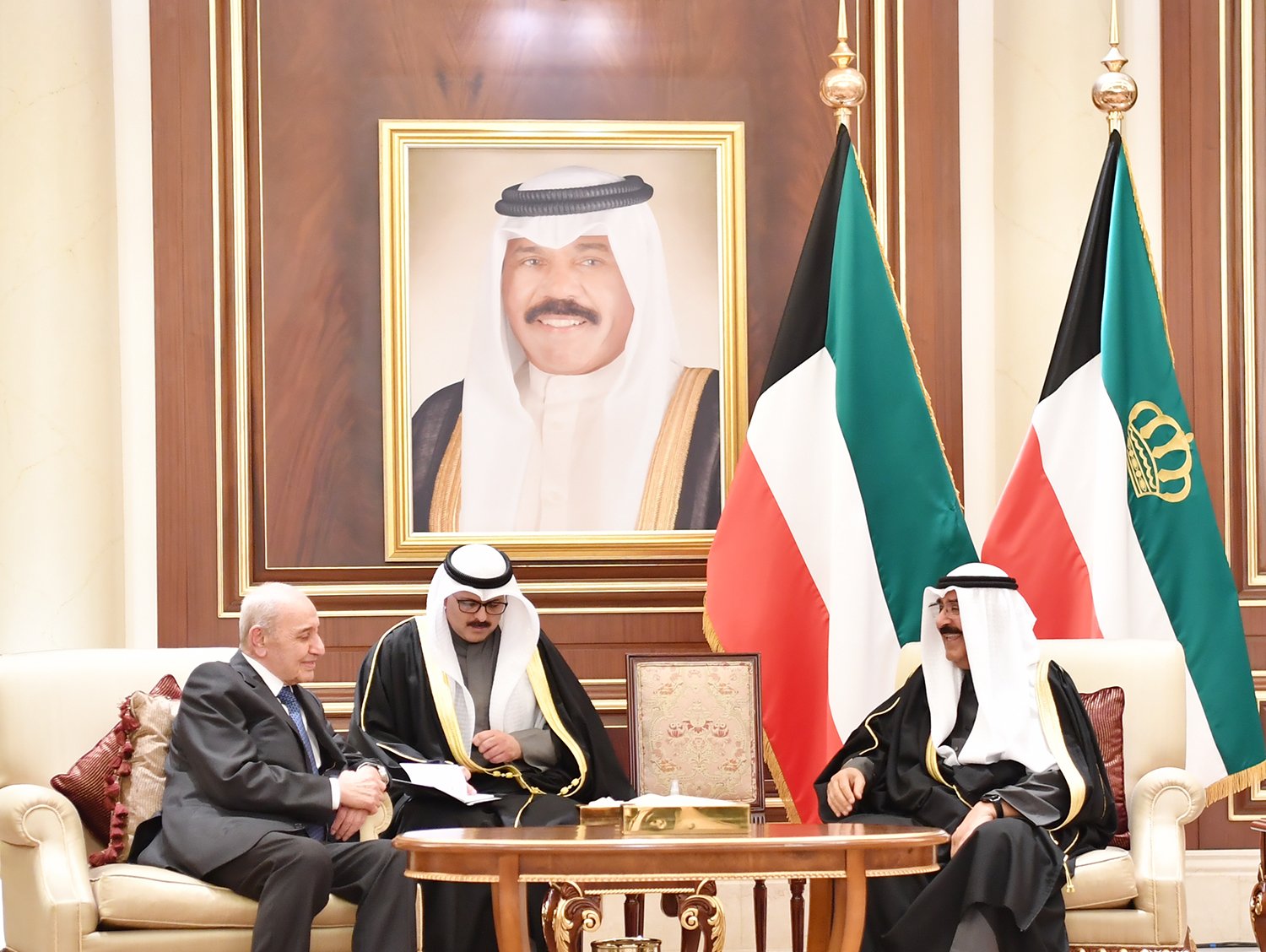 استقبل حضرة صاحب السمو أمير البلاد الشيخ مشعل الأحمد الجابر الصباح حفظه الله ورعاه في المطار الأميري مساء اليوم دولة الرئيس نبيه بري رئيس مجلس النواب بجمهورية لبنان الشقيقة ومعالي رئيس الحكومة نجيب ميقاتي ونائب رئيس مجلس الوزراء سعادة الشامي والوفد المرافق حيث قاموا بتقديم واجب العزاء في وفاة فقيد الوطن المغفور له بإذن الله تعالى حضرة صاحب السمو أمير البلاد الراحل الشيخ نواف الأحمد الجابر الصباح طيب الله ثراه وجعل الجنة مثواه. كما قدموا التعازي إلى سمو الشيخ ناصر المحمد الأحمد الصباح وسمو الشيخ جابر المبارك الحمد الصباح وسمو الشيخ صباح خالد الحمد الصباح وسمو الشيخ أحمد نواف الأحمد الصباح رئيس مجلس الوزراء وأسرة سمو أمير البلاد الراحل طيب الله ثراه وجعل الجنة مثواه وعدد من الشيوخ الكرام. وقد كان في استقبالهم على أرض المطار وزير الخارجية الشيخ سالم عبدالله الجابر الصباح.