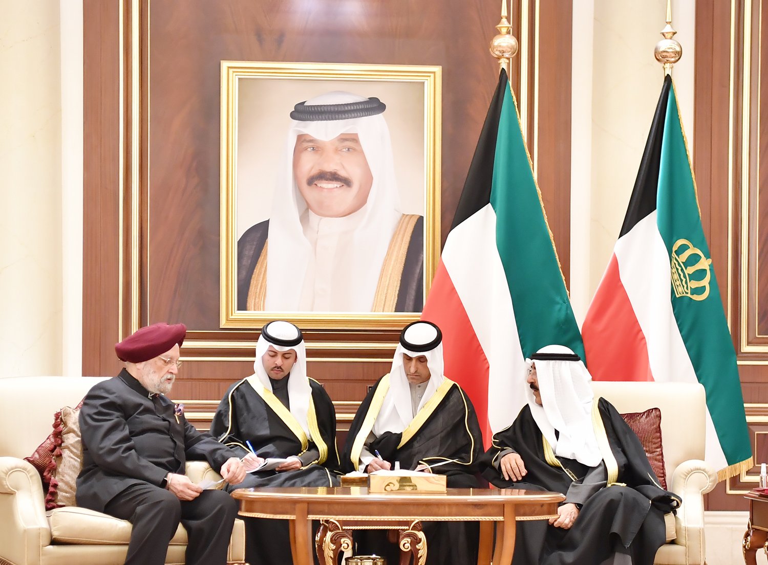 استقبل حضرة صاحب السمو أمير البلاد الشيخ مشعل الأحمد الجابر الصباح حفظه الله ورعاه في المطار الأميري مساء اليوم ممثل الحكومة بجمهورية الهند الصديقة معالي وزير النفط والغاز الطبيعي هارديب سينغ بوري والوفد المرافق لمعاليه حيث قام معاليه بتقديم واجب العزاء في وفاة فقيد الوطن المغفور له بإذن الله تعالى حضرة صاحب السمو أمير البلاد الراحل الشيخ نواف الأحمد الجابر الصباح طيب الله ثراه وجعل الجنة مثواه. كما قدم معاليه التعازي إلى سمو الشيخ ناصر المحمد الأحمد الصباح وسمو الشيخ جابر المبارك الحمد الصباح وسمو الشيخ صباح خالد الحمد الصباح وسمو الشيخ أحمد نواف الأحمد الصباح رئيس مجلس الوزراء وأسرة سمو أمير البلاد الراحل طيب الله ثراه وجعل الجنة مثواه وعدد من الشيوخ الكرام. وقد كان في استقبال معاليه على أرض المطار وزير الخارجية الشيخ سالم عبدالله الجابر الصباح.